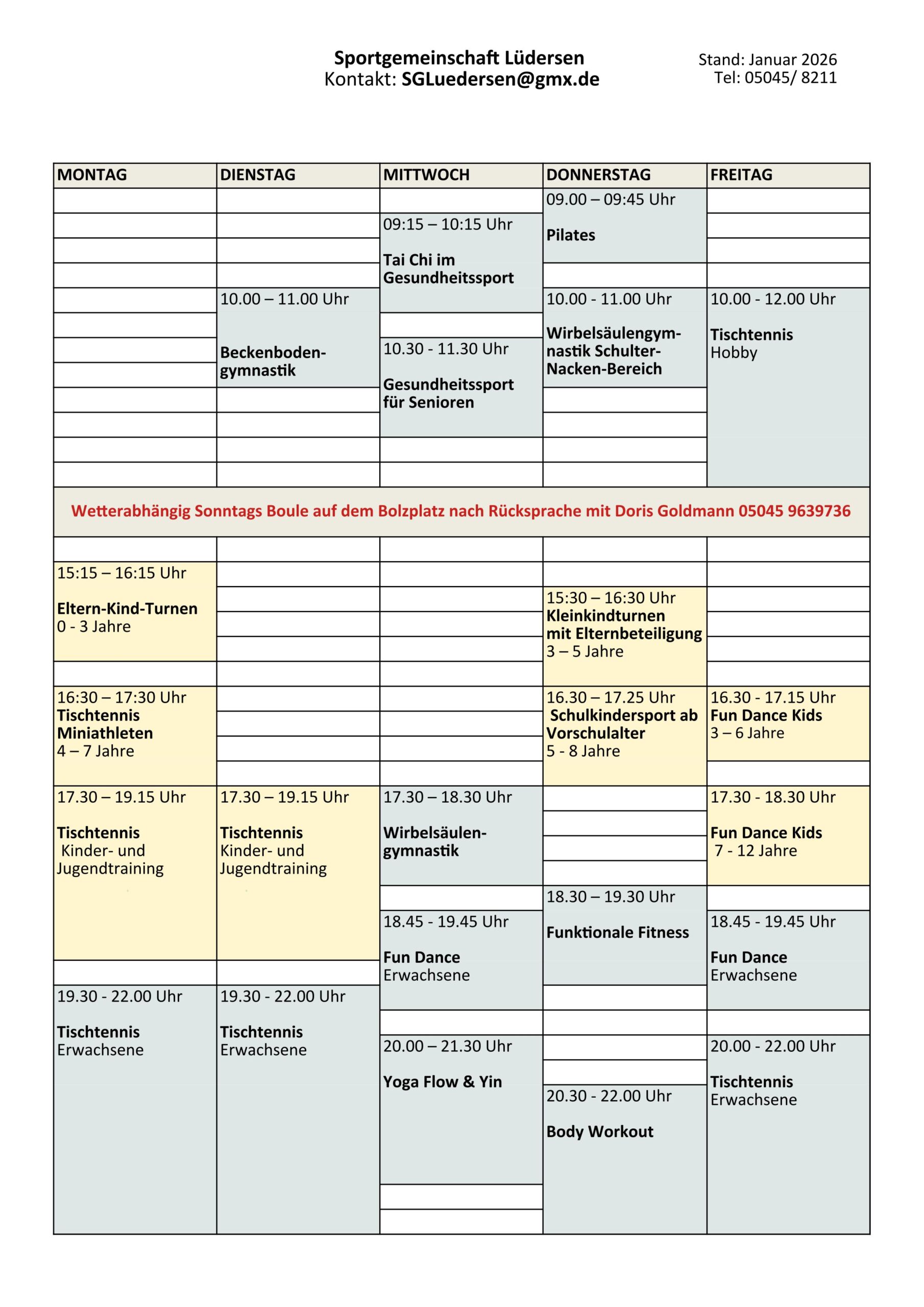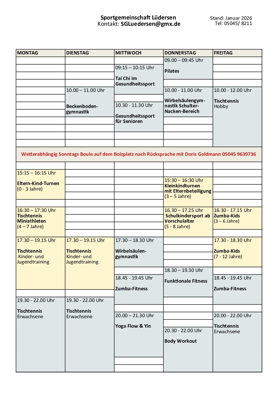 Regelmäßiges Sportangebot der Sportgemeinschaft Lüdersen e.V.